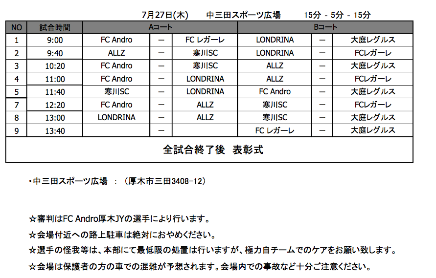 期日:7月27日(木) 会場:中三田スポーツ広場(厚木市三田3408-12)